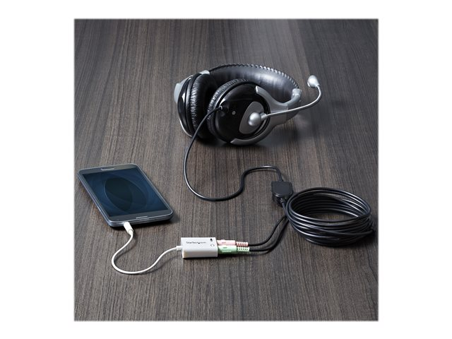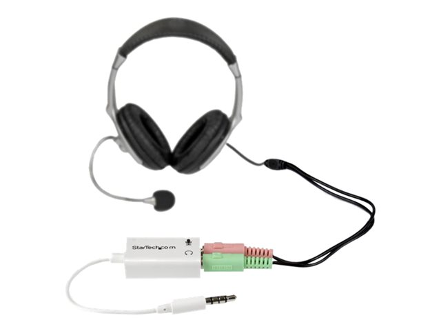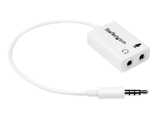 Have you recently purchased a newer laptop or Ultrabook and now you can't figure out where to plug in your favorite headset? Most new laptops and Ultrabooks come equipped with a single 3.5mm 4-position (4pin) audio port that supports both audio input and output. A great number of headsets on the market come equipped with two separate headphone and microphone connectors that are not compatible with this new configuration. The MUYHSMFFADW white headset adapter features two 3.5mm 3-position ports that provide a separate headphone and microphone connection that can be connected to the single audio port on your laptop. Alternatively, you can also connect a separate microphone and powered speakers if you prefer to use Skype or chat online without using a headset. Simply connect the headphone plug from your headset into the audio output port marked with the headphone symbol, and connect the microphone plug into the audio input port marked with the microphone symbol. Plug the adapter into the audio port on your laptop and you're all set. Want to work or game without using a headset? You can also connect a microphone and powered speakers to your laptop using the adapter. Just plug in your microphone into the audio input port marked with the microphone symbol, and plug your powered speakers into the audio output port marked with the headphone symbol, and connect the adapter to the audio port on your laptop. Are you travelling for work or taking a trip? The headset adapter features a compact and sturdy design that makes it the perfect solution for mobile applications. Tuck the adapter in with your tablet or slip it inside another carrying case. It works great with tablets and smartphones that have a single audio port. Just connect the headphone and microphone plugs from your headset into the adapter, connect the adapter to your mobile device and start talking. This adapter is not a headphone splitter or Y-cable. It cannot be used to split the audio output to two separate sets of headphones or speakers. Some laptops and mobile devices will not work with all external microphones. This is typically caused by an impedance mismatch between the microphone and the device. This is due to hardware incompatibility and is not a limitation of the MUYHSMFFADW adapter.