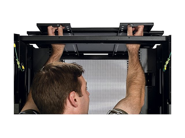 - Equipment mounting rails integrate with patch cabling systems
